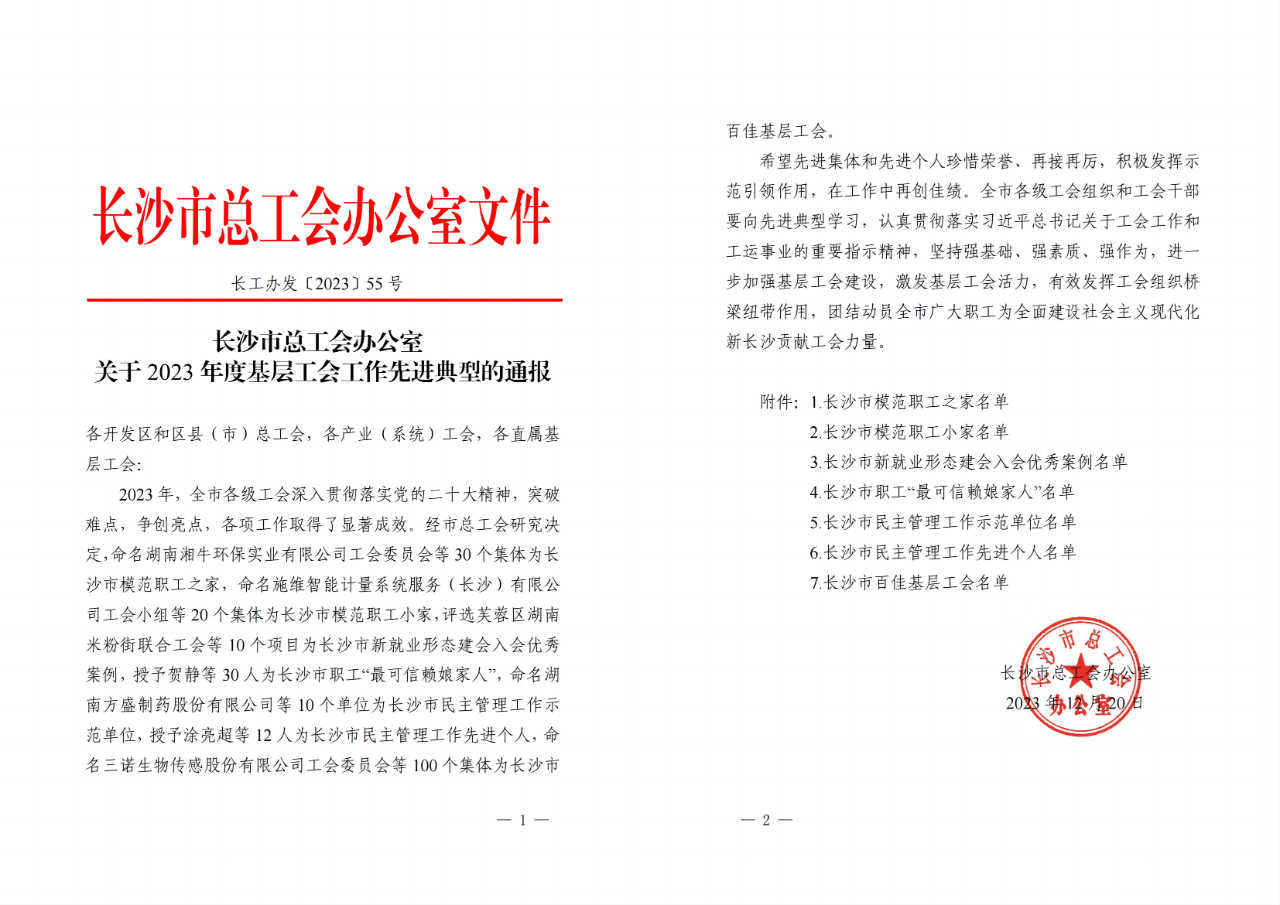 12月20日,長(zhǎng)沙市總工會(huì)辦公室印發(fā)《關(guān)于2023年度基層工會(huì)工作先進(jìn)典型的通報(bào)》,評(píng)選和表彰了一批先進(jìn)集體和先進(jìn)個(gè)人,長(zhǎng)沙城市發(fā)展集團(tuán)有限公司工會(huì)委員會(huì)被命名為“長(zhǎng)沙市百佳基層工會(huì)”。